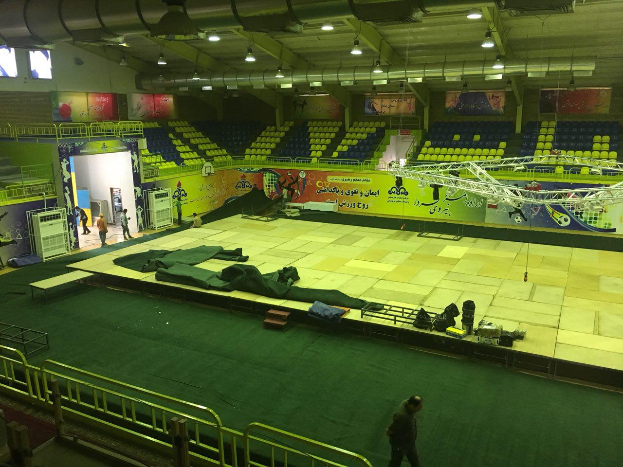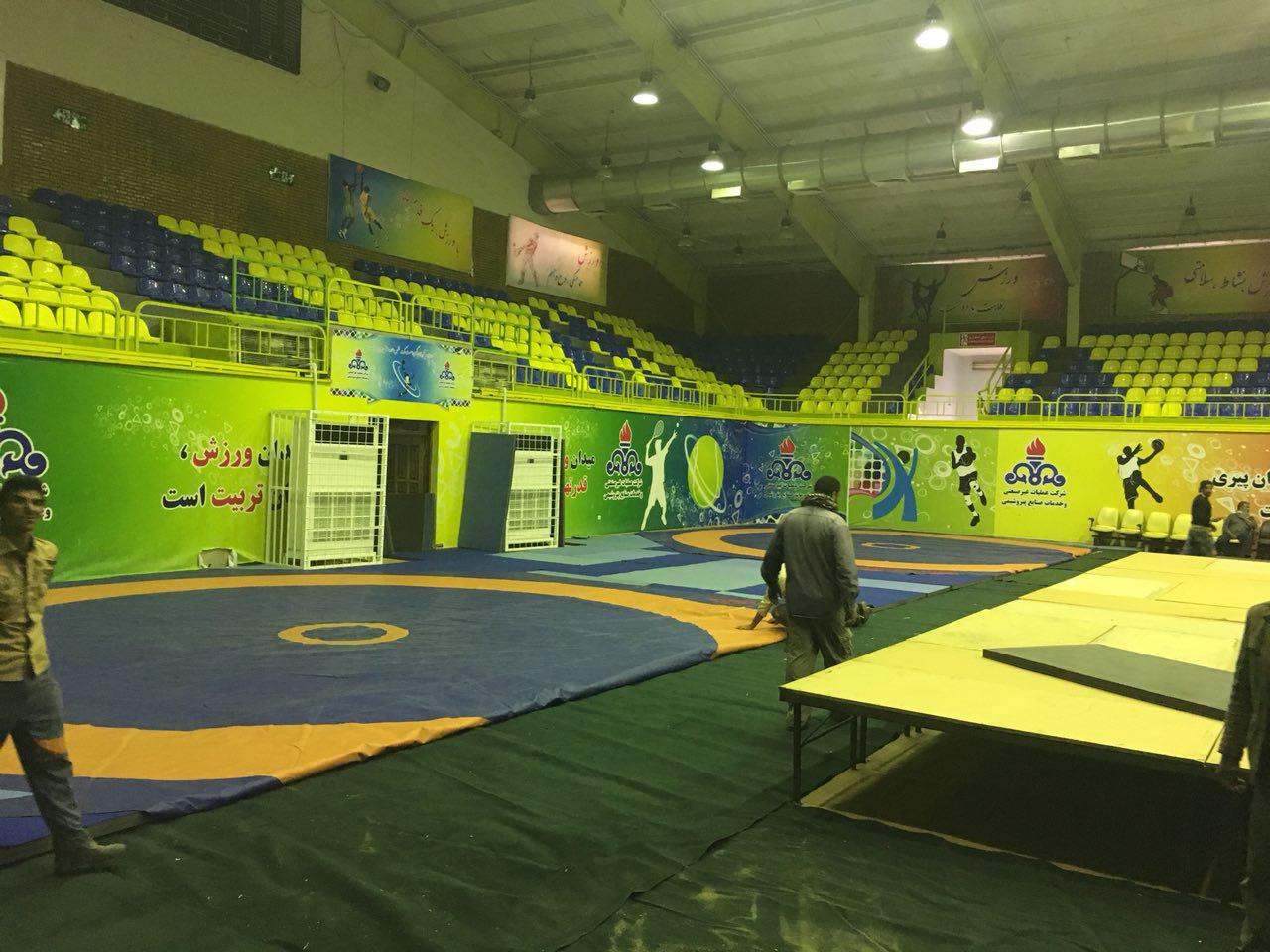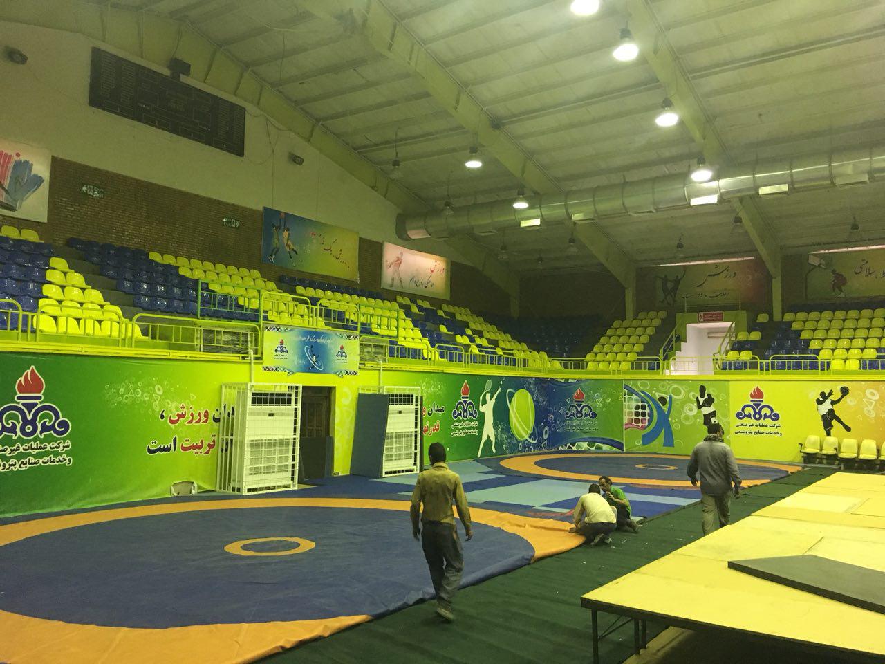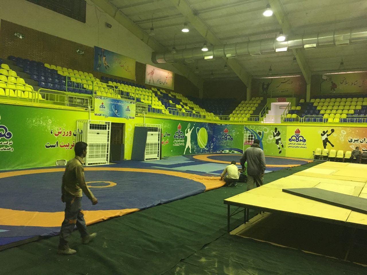 روند آماده سازی سالن برگزاری رقابت های بین المللی کشتی فرنگی جام تختی (گزارش تصویری)