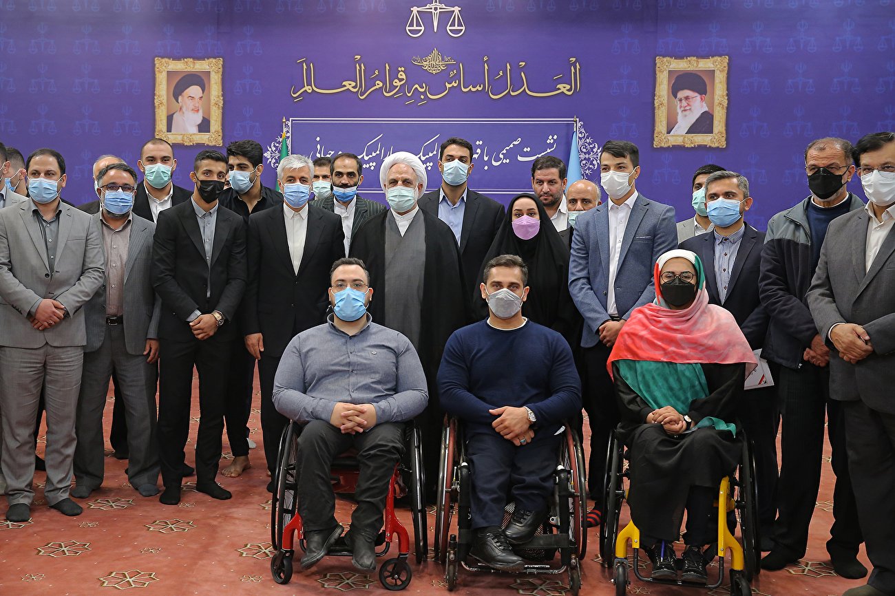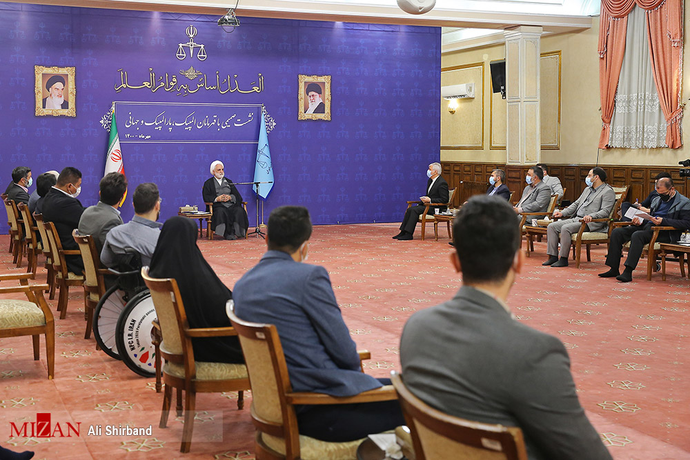 رئیس قوه قضاییه در بخش دیگری از سخنانش بر لزوم اجرای همه جانبه قانون جامع حمایت از معلولان که مورد مطالبه ورزشکاران پارالمپیکی بود تأکید کرد و گفت که سازمان بازرسی کل کشور بر نحوه اجرای این قانون نظارت میکند و با هر گونه قصور و تخلف از قانون برخورد خواهد شد.