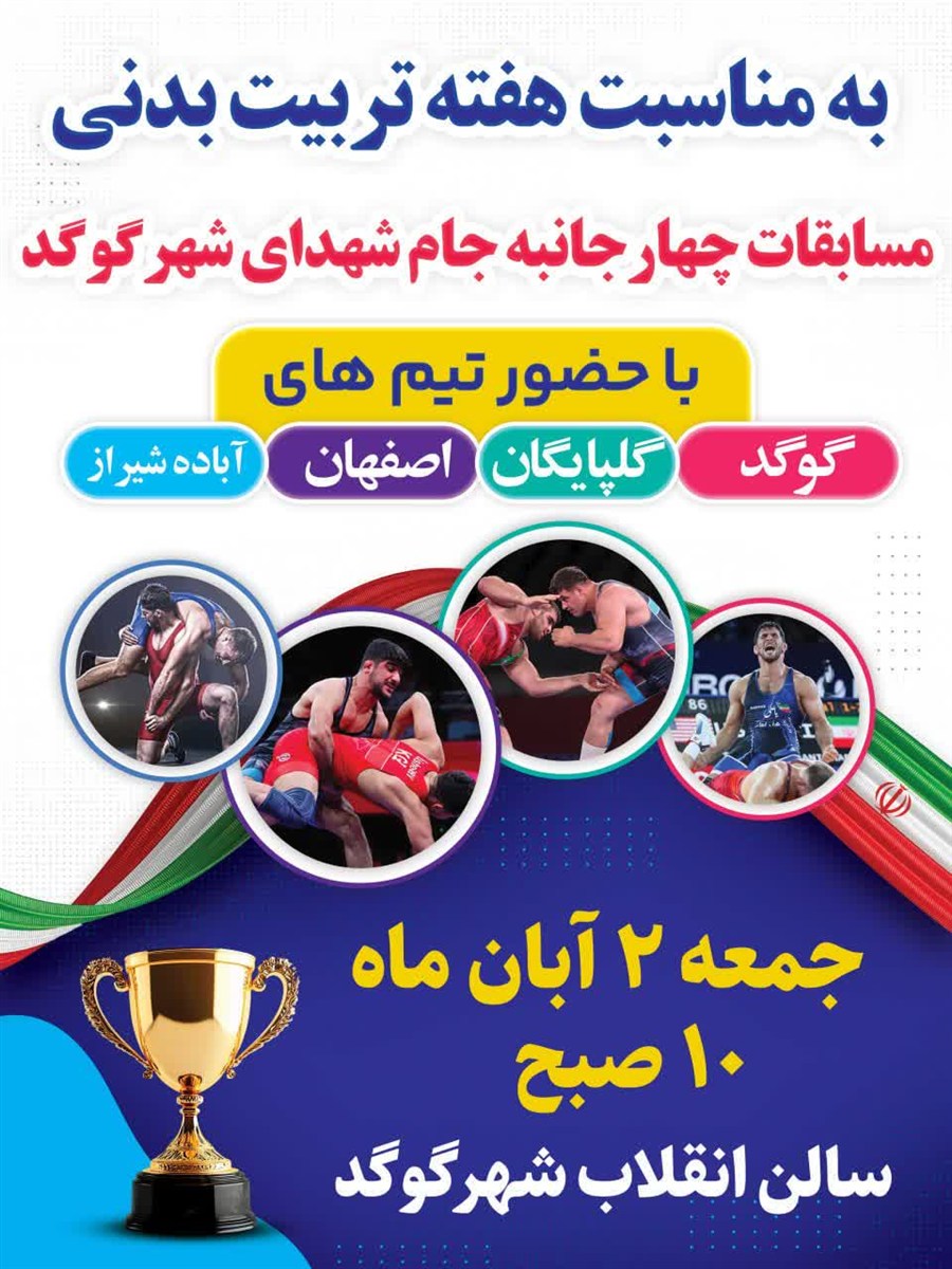به گزارش روابط عمومی فدراسیون کشتی، این مسابقات به مناسبت هفته تربیت بدنی و ورزش و با نام مسابقات چهارجانه جام شهدا با حضور تیم هایی از آباده شیراز، اصفهان، گلپایگان و گوگد روز جمعه ۲ آبان ماه برگزار شد.