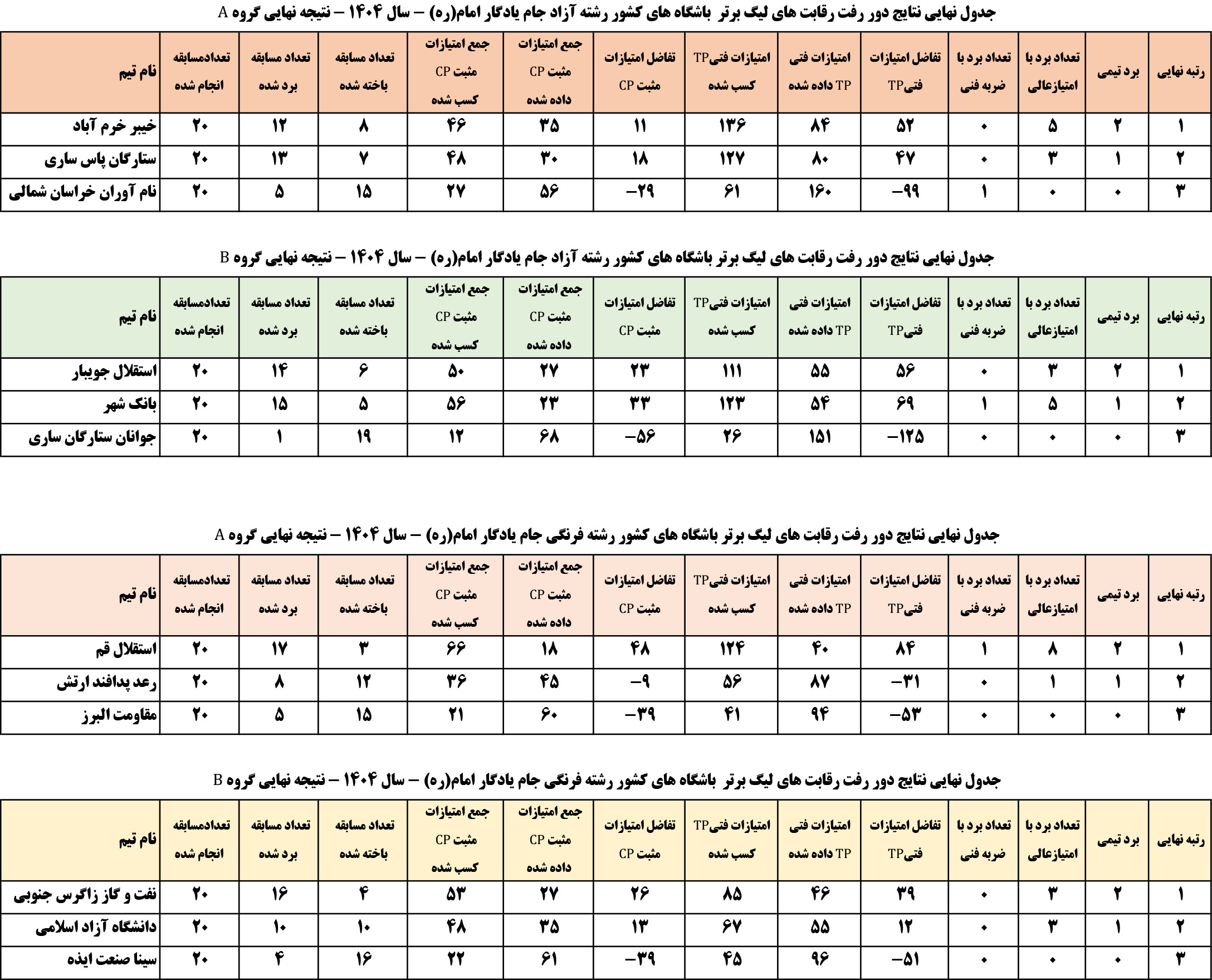 جدول رده بندی تیم ها اعلام شد